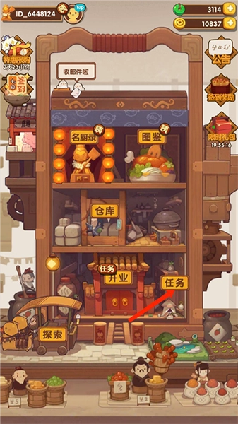 1、启动爆炒江湖游戏并进入主界面后,能看到【名厨录】、【图鉴】、【仓库】、【开业】、【探索】与【任务】等功能选项。