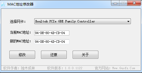 独木成林MAC地址修改器下载 1.0 绿色版 独木成林MAC地址修改器是用来修改电脑网卡mac地址之的工具。当网卡mac地址被管理员锁定无法上网时,当应用软件无法验证mac地址时,独木成林MAC地址修改器就可以帮你轻松搞定。