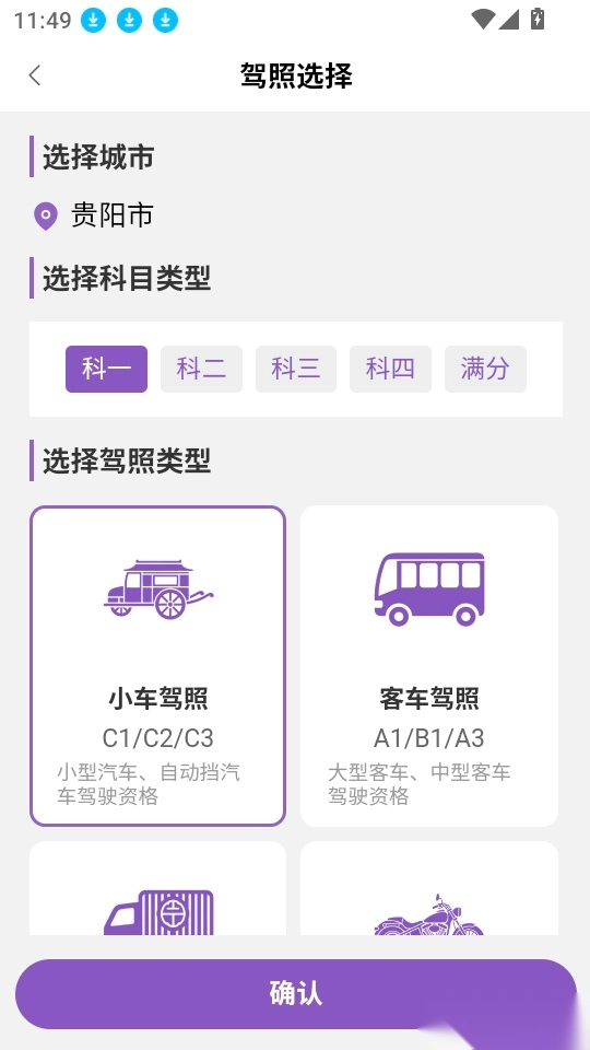接下来就可以选择小车驾照,点击“确认”按钮以推进到下一步。