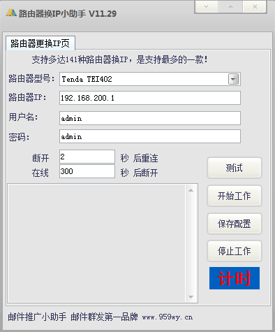 路由器换IP小助手是为方便使用路由器上网用户快速变更IP地址的一款软件。现在很网站的发布和游戏登录都会对同一IP的用户登录进行限制,我们想快捷更换IP地址又需要断网重启路由器,非常麻烦。使用路由器IP小助手只需一键就可以帮你搞定IP更换,非常简单方便。支持目前市面上所有路由器使用,欢迎下载。