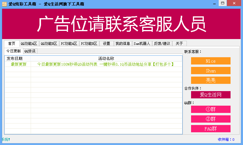 爱Q炫彩综合工具箱 v2.4 绿色版 爱Q炫彩工具箱是爱Q炫彩网推出的一款多功能电脑工具箱。软件主打QQ各项辅助功能,附带一些文本加密、gif录制、sam机器人的电脑娱乐应用功能.可以帮助您解决许多日常上网的问题,也增加娱乐性。