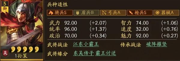 一、孙策是一名实力强劲的输出型武将,其统御值极低,因此成为了开荒阶段的得力神器。在属性成长方面,孙策拥有较为出色的武力成长,战斗时若搭配输出战法,并结合自带战法带来的破阵状态,就能打出相当可观的高额伤害。在兵种适性上,孙策具备1种S级适性和3种A级适性的兵种,无论他担任主将还是副将,在兵种选择上都能与其他武将相互适配,或是适配其他武将的兵种需求。