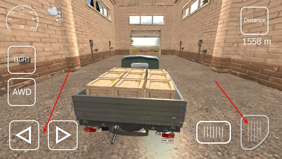 2、在车库场景下,要熟悉左侧的LIGHT、AWD等功能按钮,还有下方的方向、加速、刹车等操作按键,以此为出发做好准备。