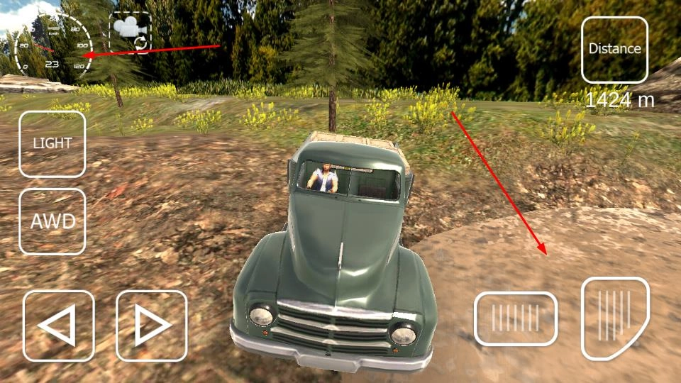 3、驾驶皮卡行驶在越野路线上,合理运用操作按键控制车辆,留意仪表盘和剩余距离,安全送达货物。