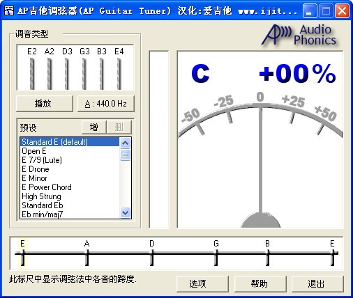 ap吉他调弦是一款能帮助你调试吉他弦音的辅助软件。这是一款非常好用而且精准的吉他调弦软件,只需要你对着电脑的麦克风进行弹奏,就能判断出弦音是高了还是低了,然后你自己进行修改。