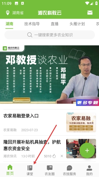 1、打开湘农科教云首页后,点击底部的【课堂】选项,即可进入课程学习的功能选择页面。