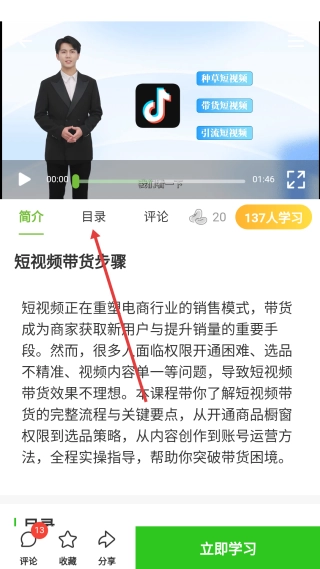 3、进入课程详情页面后,找到并点击【目录】选项,即可查看该课程所涵盖的具体学习内容模块。