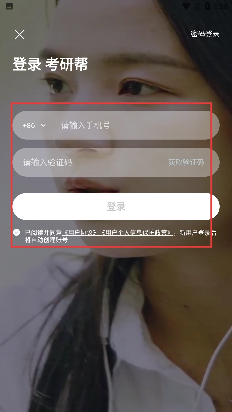 1、打开【考研帮】的登录页面,输入手机号码,点击【获取验证码】按钮,输入收到的验证码并勾选相关协议,最后点击【登录】按钮完成操作。