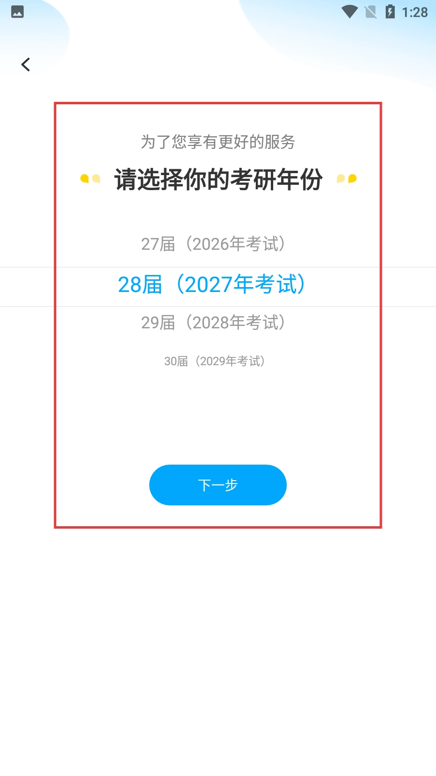 2、登录系统后,选择对应的考研年份(例如28届对应的是2027年考试),接着点击【下一步】按钮。
