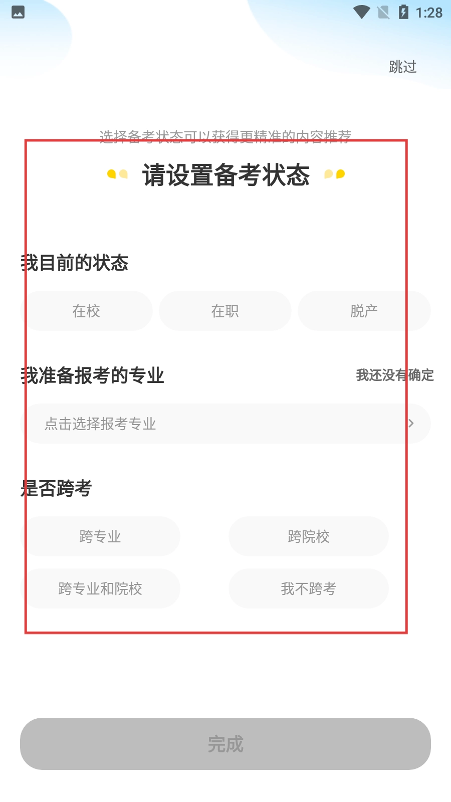 3、开启备考状态设置,依次选定当前状态、报考专业以及是否跨考,确认选择无误后点击【完成】按钮即可。