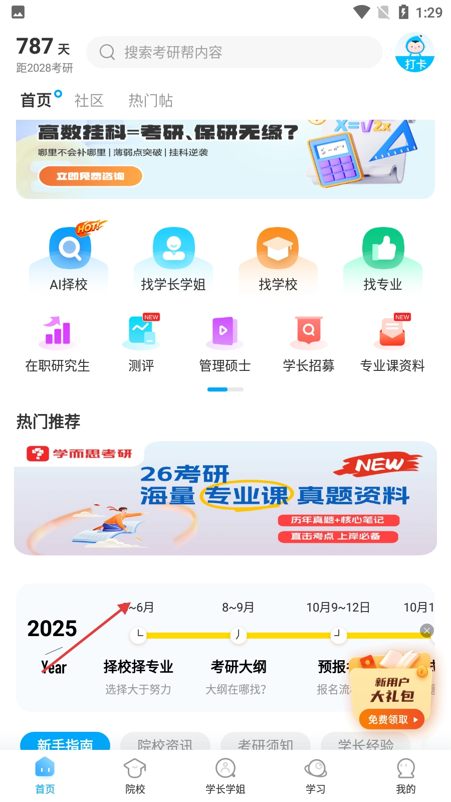 4、进入【考研帮】首页后,能利用【AI择校】【找学长学姐】这类功能,也可以浏览热门推荐内容以及考研时间线。