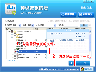 第四步:扫描完查找扫描结果,勾选需要恢复的文件,然后点击下一步。