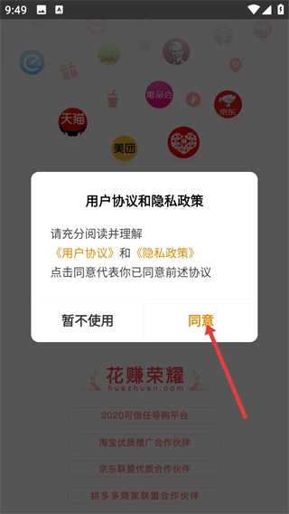 1、应用启动时会弹出【用户协议和隐私政策】的提示窗口,您需要阅读《用户协议》与《隐私政策》的内容,之后点击【同意】按钮,方可继续使用该应用提供的服务。