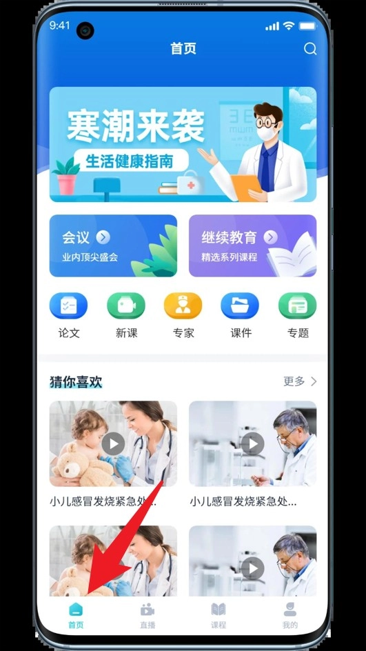 2. 打开应用程序后默认进入首页,在该页面可以查看健康指导、继续教育、专家课程以及推荐专题等内容。