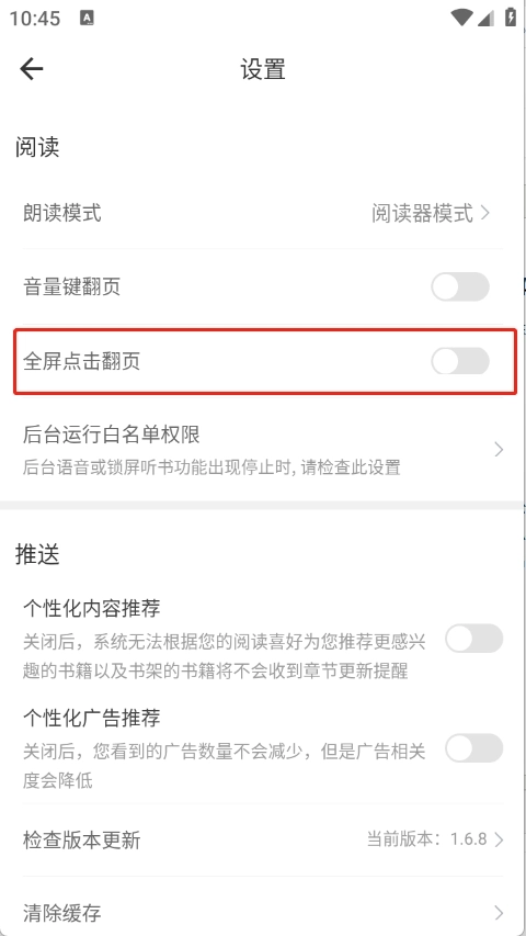 3、将全屏点击翻页后面的按钮开启即可。