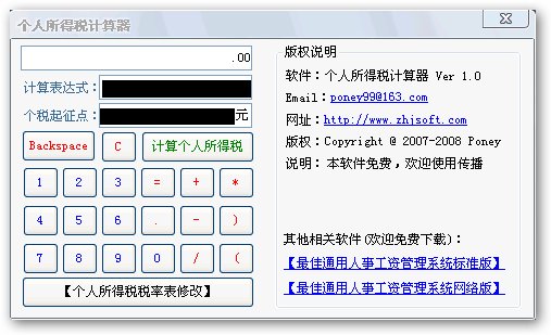 个人所得税计算器 V2.0 简体中文绿色版 该软件主要针对个人各种所得税的计算,包括工资、薪金所得;个体工商户生产、经营所得;企事业承包、承租所得;偶然所得(如中奖、中彩);劳务报酬所得;利息、股息、红利所得等等各种计算。目前均按照当前国家政策法律法规所执行的标准来进行计算,日后相应标准有所变动,软件会进行相应的调整和升级,希望定期关注下载最新标准版本使用