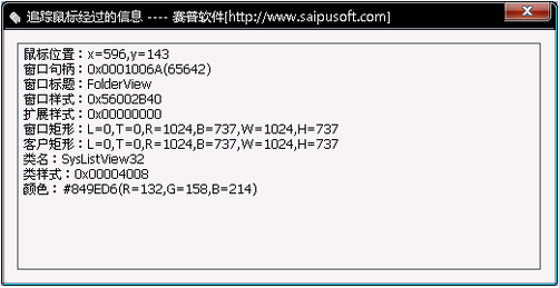 追踪鼠标经过的信息工具 V1.00 中文绿色免费版 该软件主要是提供给开发人员用于开发时候对于鼠标信息的追踪获取使用,主要在鼠标位置、窗口句柄、窗口标题、窗口样式、扩展样式、窗口矩形、客户矩形、类名、类样式、颜色等信息的追踪和获取。适用于任何鼠标途径的地方,都可以实时的查看和获取到这些所需要了解的信息