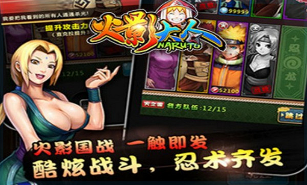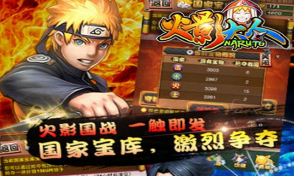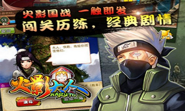 《火影大人》是一款以著名动漫《火影忍者》为故事背景的手机卡牌策略游戏,游戏中引入多种忍者角色,并在玩法上进行了重大创新,游戏中不仅有历练升级、闯关夺宝、竞技挑战等常规玩法,更是首创独具特色的国战系统。玩家在进入游戏之初便要选择火、水、雷、风、土任一国家,每晚19:30全服开启国战,各国精英齐聚一堂抗击敌人,体会万人国战千人斩的爽快感觉!每场国战力挽狂澜的英雄将受万众敬仰,圆玩家英雄梦想!每位志存高远的玩家也可以通过实力竞争国家官员乃至影者(国王),走向至尊!