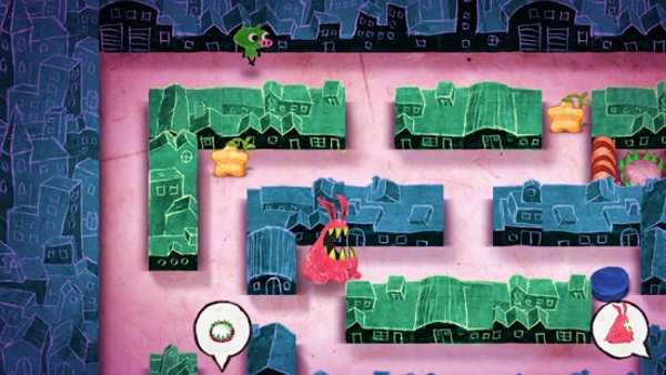 Gesundheit!鼻涕猪的游戏画面非常可爱,由手绘蜡笔画风组成。再配以轻松愉快的音乐,使得这款游戏让人眼睛一亮。游戏的故事很简单,有一只小绿猪,因为他经常喷鼻涕,所以其他小猪都很嫌弃他。只有粉红小猪愿意和他做朋友,而有一天怪物们入侵小镇,小粉红猪被抓走了。而鼻涕小绿猪发现这些怪物喜欢吃自己喷出的鼻涕,所以他利用鼻涕做诱饵,将这些怪物吸引到陷阱中消灭。