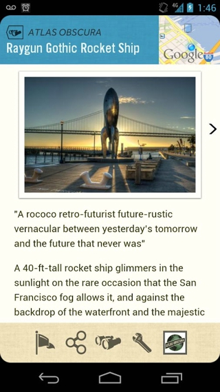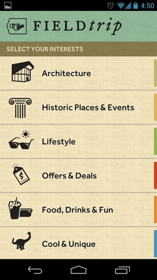 Field Trip非常适合旅游的时候使用,当你来到一个陌生的地方,对一切都不了解,那么这个时候打开Field Trip,购物、餐饮及娱乐场所,它都能带给您非常详尽的信息介绍,让你在异地也能像在家一样熟悉每个好吃的、好玩的地方。不过Field Trip也有缺点,只是国内不知道信息收集的怎么样,在国外应该好些。