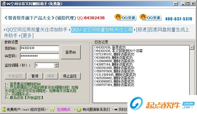 QQ空间访客实时删除助手是一款由智者软件开发的qq空间访客记录删除工具,可以帮助你实时删除QQ空间最近访客的记录,并且可以自定义调节监控速度,实时日志显示,循环不断件监控删除!