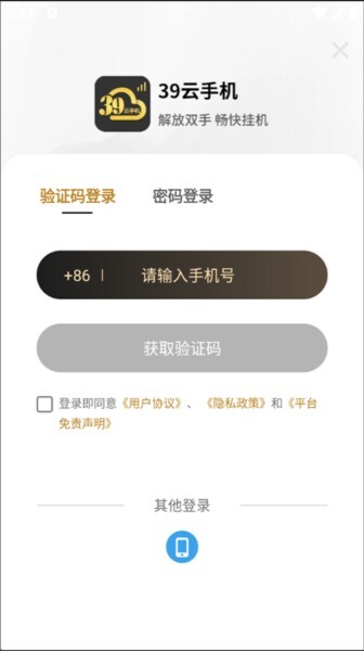 1、在本站安装好39云手机应用后,打开该应用时需通过手机号接收验证码进行登录操作。