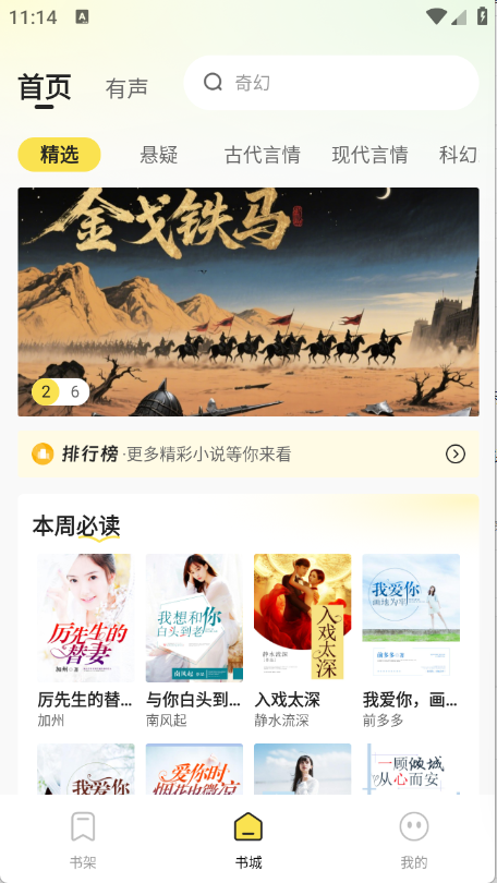 2、书城页面汇聚了丰富多样的小说资源,涵盖言情、悬疑、科幻等多种类型。