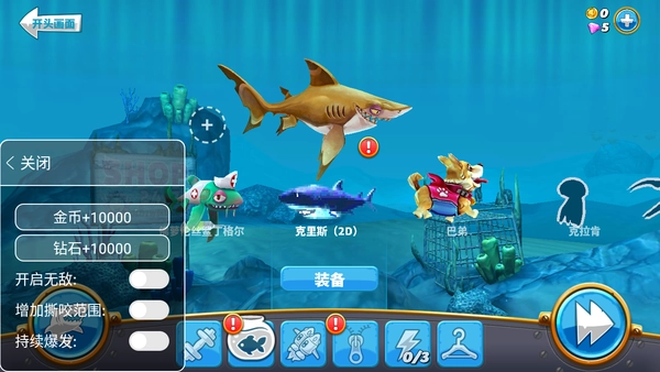 给你的鲨鱼装升级那些超酷的配件吧,让它咬合力更强、游动更迅猛,变得更有攻击性!每只准备出击的鲨鱼都少不了耳机、雨伞和超炫的喷射背包!