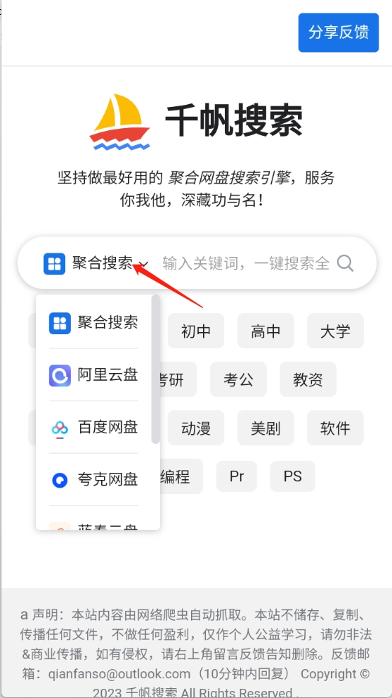 1、支持百度网盘、阿里云盘、夸克网盘、迅雷云盘等常见网盘的搜索功能。