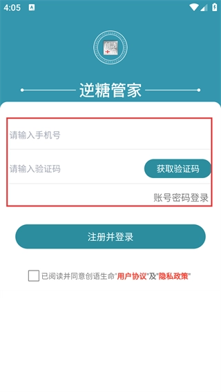 2、进入逆糖管家登录页面,选择手机验证码登录方式,在【请输入手机号】输入框中填写手机号,点击【获取验证码】按钮并输入收到的验证码,最后点击【注册并登录】按钮完成操作。