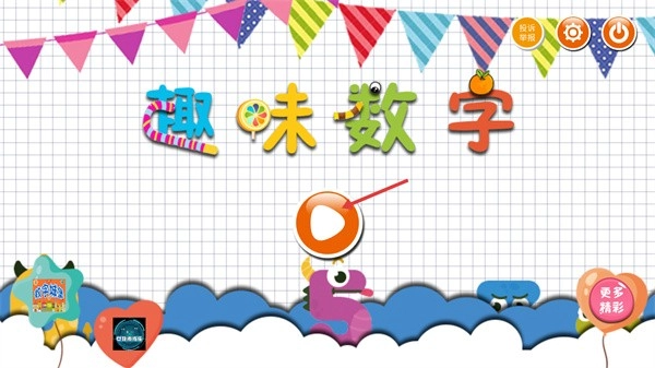 1、在【趣味数字】的启动界面,点击中间那个橙色的播放按钮,就能进入到有多个数字学习功能的选择页面。