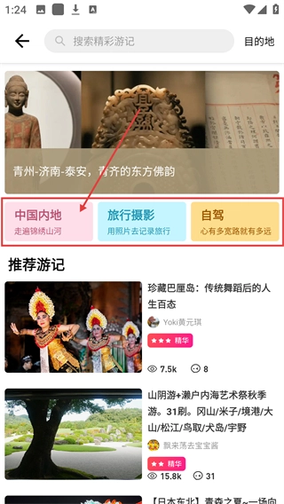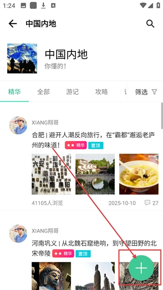 进入游记专区后,选择【中国内地】分类,就能看到国内各地的旅行游记,这样筛选对应区域的内容会更方便哦。