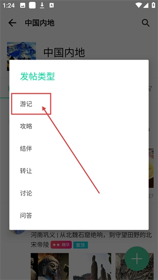 3、在“中国内地”游记页面,点击右下角的加号按钮,会弹出发帖类型选择菜单,以便准备发布内容。