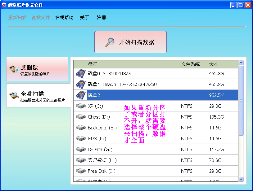 2.全盘扫描功能(恢复格式化分区或者打不开的分区,最彻底的扫描磁盘图片数据)