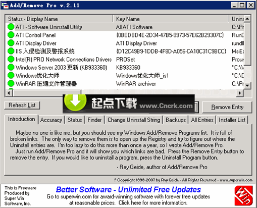 Add/Remove Pro V2.11 英文绿色特别版 往往装了太多软件后,想反安装时,却发现使用控制面板的新增/删除程序竟无法移除它,这时只要使用Add-Remove Pro 将帮助你 除去这些顽固的应用程序,它除了反安装程式外还有清除整理在控制面板的新增/删除程序里以没用或无效的软件清单。