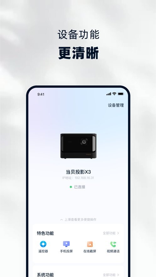 系统具备多项功能,像找回遥控、设置、自动对焦、梯形校正等都能支持。