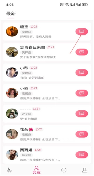 1、启动软件后,进入最新动态列表页面,能看到糖宝等用户发布的内容,点击糖宝头像旁的聊天按钮,即可进入与糖宝的对话界面。