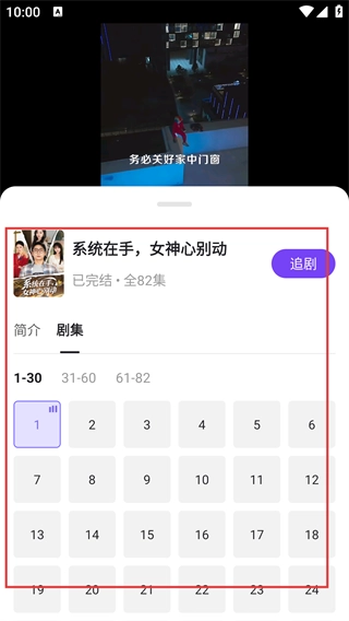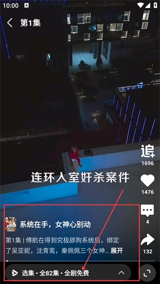 3、点击已选中的短剧进入播放页面,接着点击【选集·全82集·全剧免费】按钮,即可展开剧集选择界面。