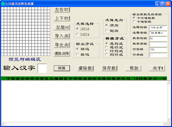 1.本程序可把预览与编辑区内(即栅格区)的点阵转化为数值代码;2.本程序可直接输入16*16的汉字,16*8的ASCII码,24*24的汉字,输入字符后,它的点阵图形随即显示在栅格区内;
