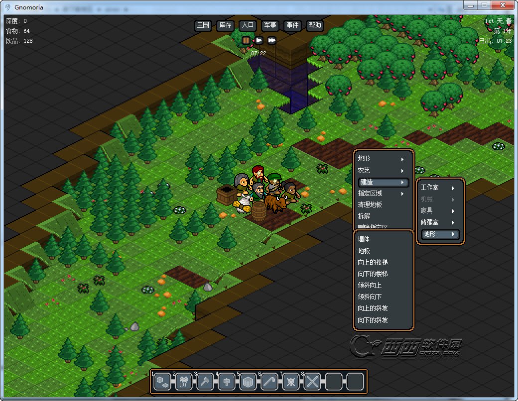 在游戏正式开始前,我还要给要塞选个合适的地址。信息栏里显示了当前地区的生物圈和地质信息。“生物圈”会告诉我这里是温带阔叶林还是热带大草原,植被有多少,是否有河流经过,周边是否有其他种族文明,野蛮程度如何。虽然游戏画面是2D的(甚至连2D也算不上),但DF以一种很巧妙的类似等高线的形式来表现游戏世界里的高低落差,因此可以产生高原盆地、悬崖峭壁的地质形态,甚至还把水压也考虑了进去,这些元素都会对我的要塞产生影响,或好或坏。最后我选了一块植被丰富,没有含水层、野蛮度极低的温和区域,这里的土质适合发展,并且有一条河流经过,绝对是标准的文明发源地。确定了地址,接下来……还不能进入游戏。我需要给我的矮人配置不同的职业以确保他们互相搭配能在这个世界生存下去。因为地址附近有大量的植被,我便带了一个木匠/伐木工、一个矿工/石匠、一个机械师/农民、一个工匠/植物学家、一个厨师/屠夫和猎人/酿酒师,看起来这还远远不够,但如果要塞发展得比较成功,还会有矮人源源不断地移民过来。
