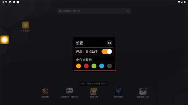 1、打开设置弹窗,找到【小白点助手】的开关并开启,接着挑选你想要的对应颜色,这样就能启用快捷操作浮窗功能了。
