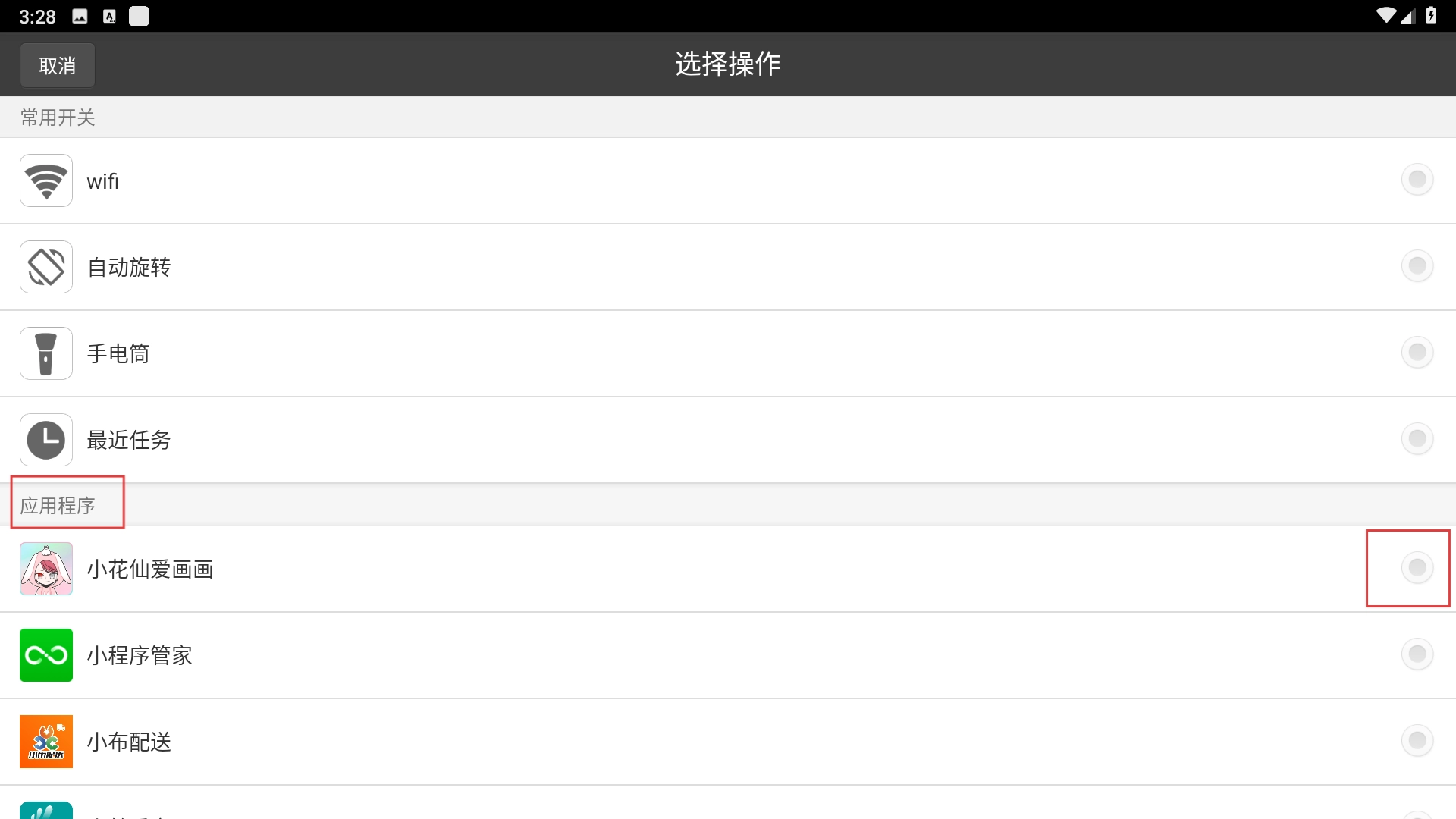 4、进入【选择操作】页面后,在【应用程序】分类里找到对应的选项(例如小花仙爱画画)并勾选,这样就能把该应用添加至小白点的快捷功能中。