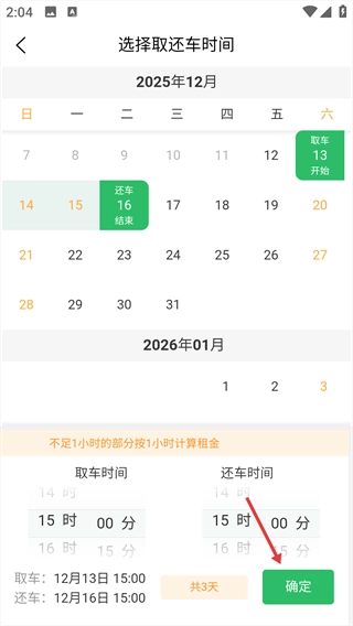 1、点击取还车时间区域,即可进入【选择取还车时间】页面。