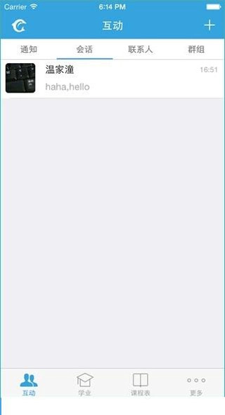 2、登录成功后,进入互动页面,就能看到你与朋友的会话界面,同时你可以和联系人进行互动,也可以创建或加入群组。