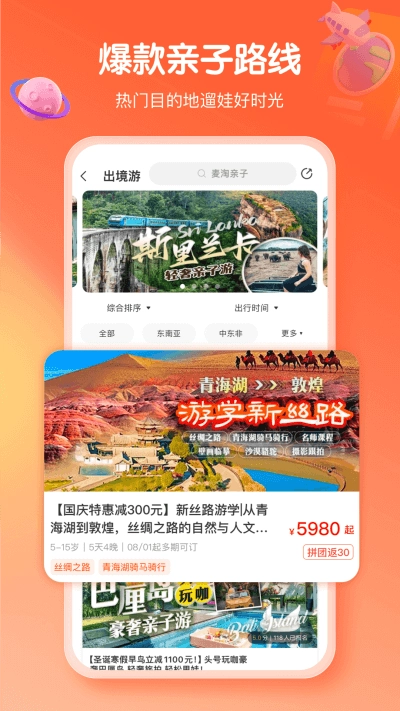 麦淘亲子是一款专门针对亲子旅游打造的出行应用。和其他旅行类软件类似,它也会推出热门的亲子游路线,家长们可以根据自己的喜好挑选热门目的地带孩子出游。平台上的活动类型十分多样,无论是本地玩乐、酒店预订,还是演出展览、兴趣启蒙、亲子活动、夏令营、周边游、国内游等项目,都能在麦淘亲子上直接完成预订,操作起来很便捷。要是你平时也在为亲子游的安排而烦恼,不妨尝试使用麦淘亲子这款软件。