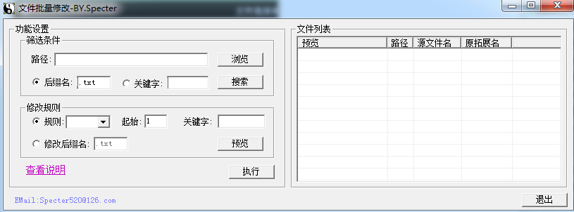 文件批量修改软件是一款用于修改软件后缀名的工具。软件页面简洁,操作简单,只需输入后缀名或者关键词就可以对你所需的软件进行批量修改,支持筛选。修改后的文件都是可以正常使用的,不会出现文件错误或者文件损坏的情况,可以放心使用。