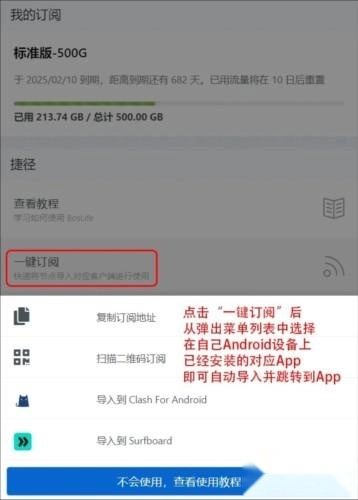 1、使用已安装客户端的安卓设备自带浏览器登录个人中心,在仪表盘页面下方的捷径区域找到“一键订阅”按钮,点击后选择“导入到”选项,系统会自动提示跳转到客户端。