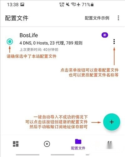 为保证节点配置文件始终处于最新可用状态,需不定时更新节点订阅。具体操作步骤如下:首先进入配置文件页面,接着点击屏幕右侧的三点图标,在弹出的菜单里选择“检查更新”选项,稍作等待后,节点订阅的更新操作便会完成。