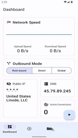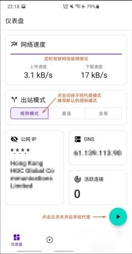 4、进入仪表盘界面后,可在此界面切换不同的**模式,建议优先使用默认的规则模式,该模式会依据配置文件中的规则自动对网络数据进行分流处理。