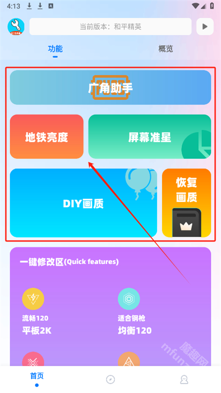 3、进入首页后,浏览广角助手、地铁亮度、屏幕准心等各项功能。